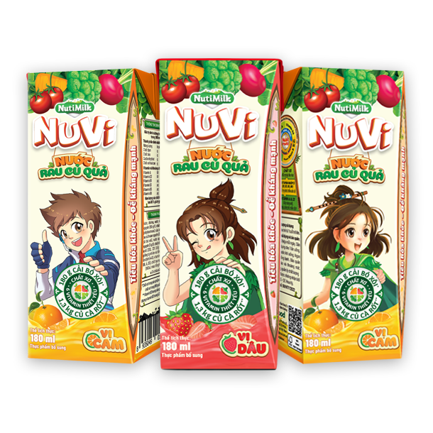 NUVI vegetable juice is designed exclusively for Vietnamese children to meet 75% of the demand for daily fibe for children. In 180ml of the product, the content of fiber is equivalent to 180g spinach and vitamin equivalent to 1.3kg Carrot.