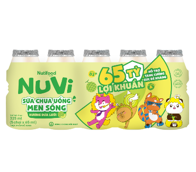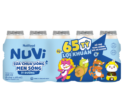 Sữa Chua Uống Men Sống NuVi chứa 65 tỷ lợi khuẩn - bổ sung binh đoàn phòng thủ vững vàng đẩy lùi các hại khuẩn, cho hệ đường ruột luôn khỏe mạnh. Đồng thời NuVi Sữa chua uống men sống còn bổ sung nhiều loại vitamin như A và D hỗ trợ tăng sức đề kháng.